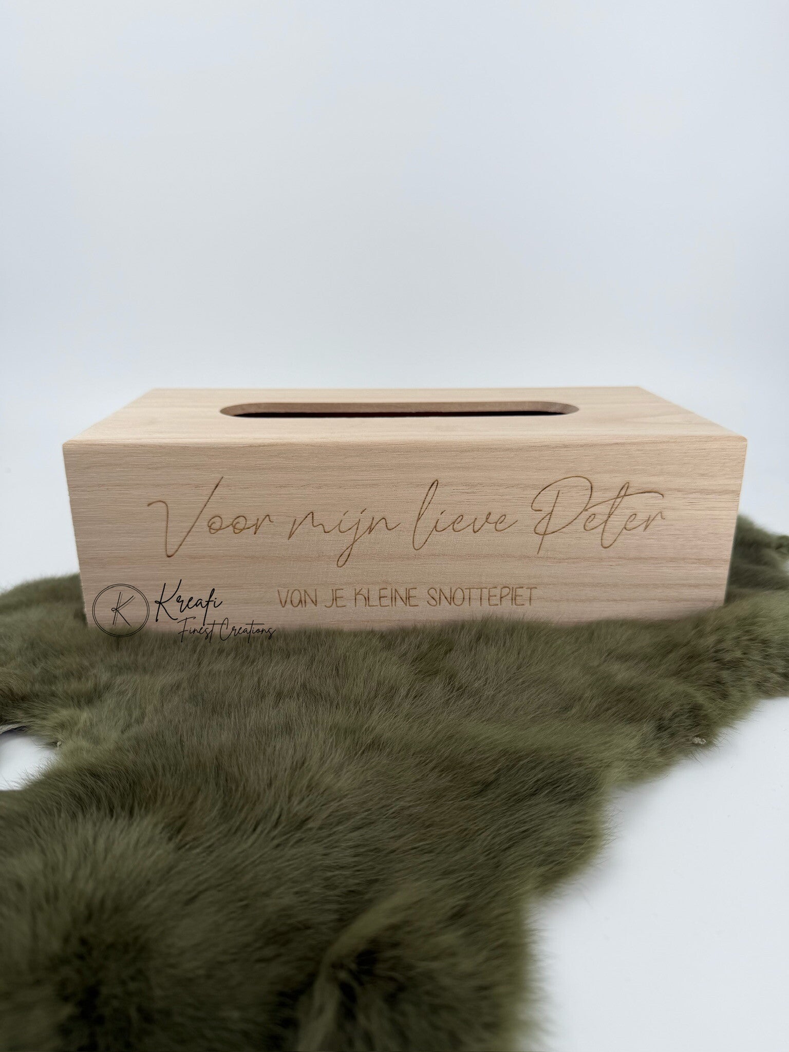 Tissuedoos naar wens gepersonaliseerd. Deksel schuift aan de onderkant weg om de tissuedoos makkelijk te vervangen.