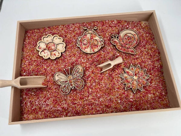 Vulvormen in het thema lente voor de sensory speelbak. Worden geleverd in een linnen zakje om te bewaren.