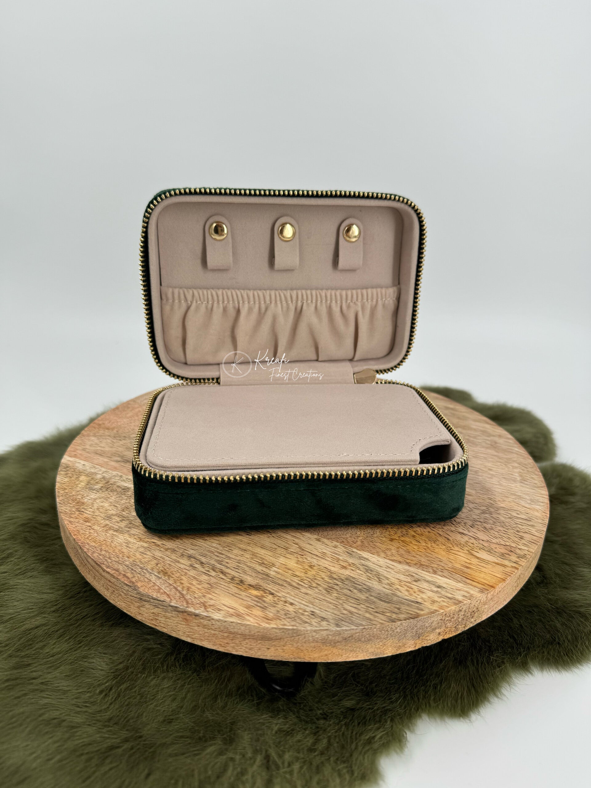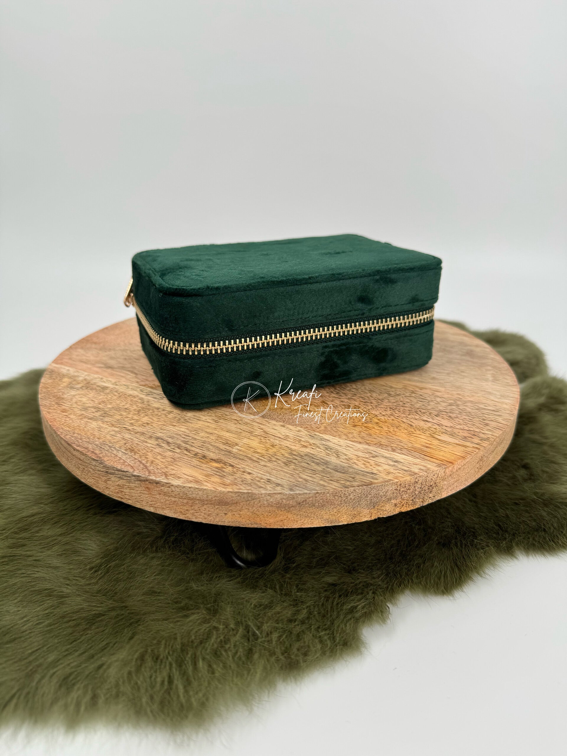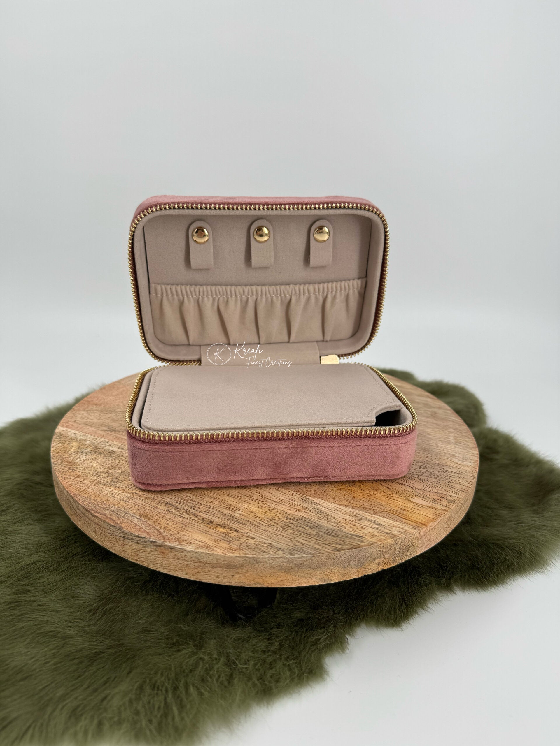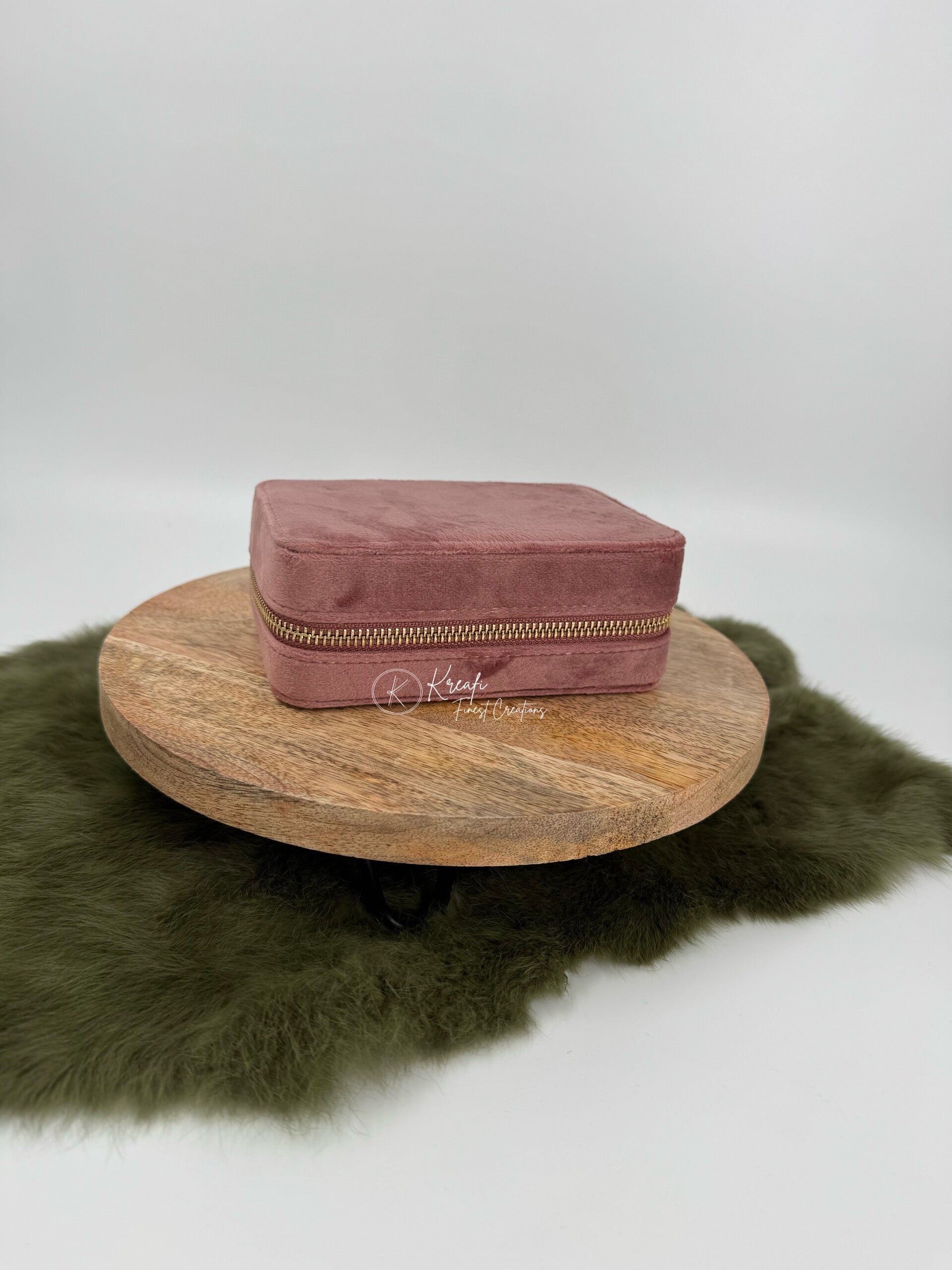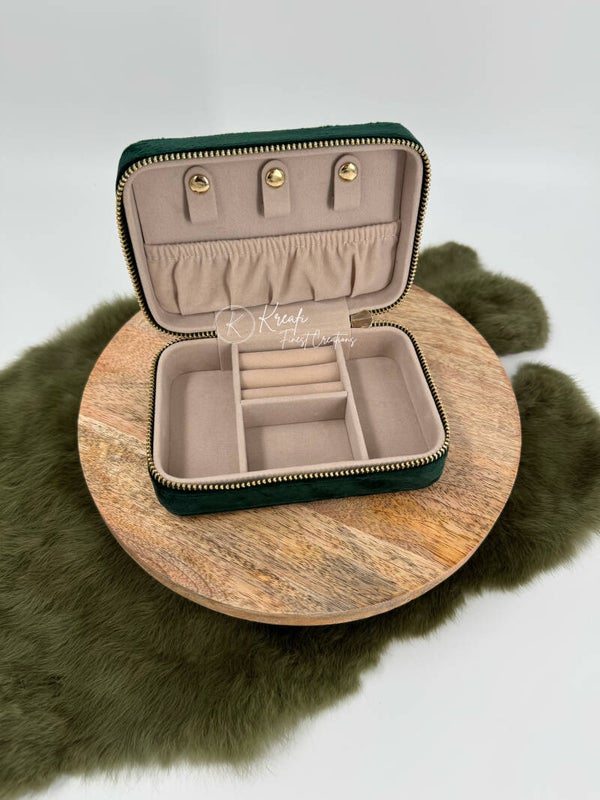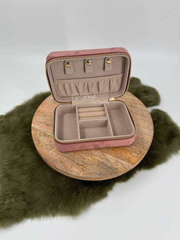 Juwelenbox met velvet stof. Handig om mee te nemen op reis. Plaats voor ringen, oorbellen, kettingen, armbandjes, .. Kan gepersonaliseerd worden naar wens.